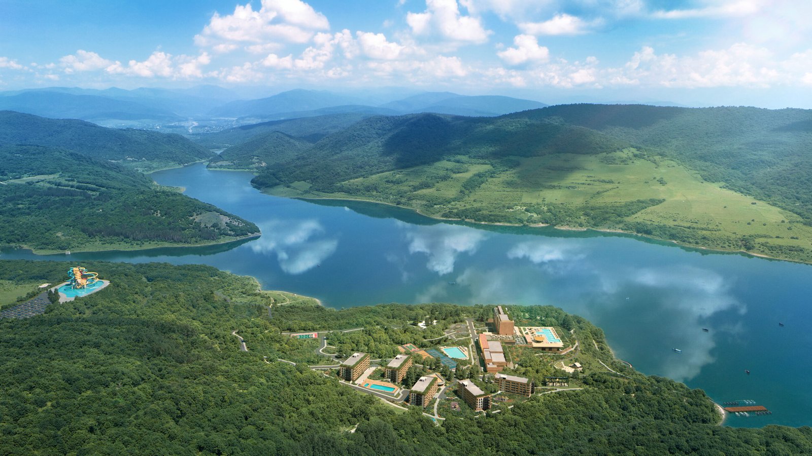 Set against the tranquil backdrop of Sioni Lake, Le Méridien Lake Resort by Archi is a refined fusion of luxury hospitality and nature-inspired architecture. The resort’s design celebrates the fluidity of water and the serenity of its surroundings, offering a curated experience of leisure, wellness, and cultural sophistication. With its elegant spatial composition, locally rooted materials, and seamless integration into the lakeside landscape, the project redefines resort living in Georgia. The masterplan includes a five-star Le Méridien hotel, fully serviced apartments, and 25 private villas, all designed to blend harmoniously with the natural terrain. The architecture, developed in collaboration with Chapman Taylor Madrid, emphasizes sustainability through the use of energy-efficient Ytong blocks, low-emission glass, and decorative wooden elements. These materials not only reduce environmental impact but also enhance the aesthetic connection to the surrounding forest and lake. Guests and residents enjoy access to a wide range of amenities: over 2,500 sq.m. of indoor and outdoor pools, a water park, a winter hot pool, and a 3,000 sq.m. spa and wellness center. The resort also features five restaurants, a bar, a lounge, and cafés, as well as a banquet hall for 550 guests, conference facilities, and a rooftop terrace. Outdoor attractions include a 3 km lakeside boulevard with walking and cycling paths, sports courts, a helipad, a fishing area, and even a zip line. Located just 50 km from Tbilisi and near the Tbilisi National Park, the resort is positioned as a year-round destination. The Sioni Le Méridien Masterplan is not only a hospitality project—it is a vision for sustainable, immersive, and elevated living in one of Georgia’s most scenic regions..